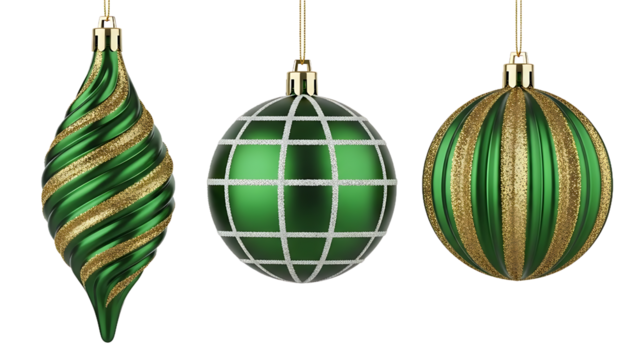 A curated collection of three distinct green and gold holiday ornaments, featuring elegant swirl, grid, and stripe patterns for festive decoration
