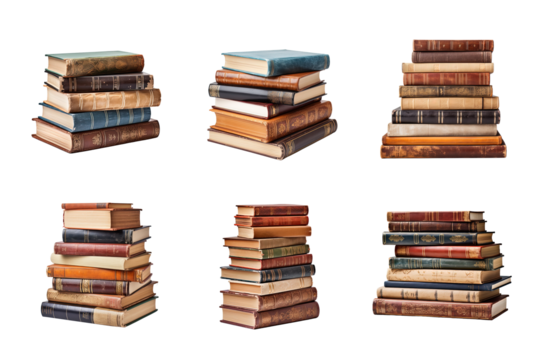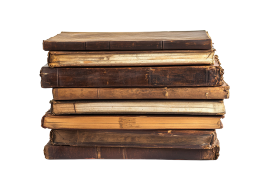 Stack of old antique leather bound books isolated on transparent background. Books stacked together isolated on white background.