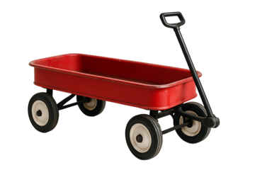 Red toy wagon with deep tray and white rims, minimalist studio isolation for e‑commerce, packaging, and print layouts