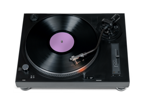 Black DJ record player with vinyl disc, isolated on a transparent background PNG. Great for music, DJ, vintage audio, and retro-themed creative projects.