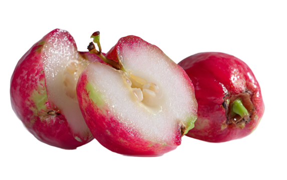 Rose apple sliced to reveal crisp white interior showcasing juicy tropical fruit freshness and natural texture isolated on transparent background PNG