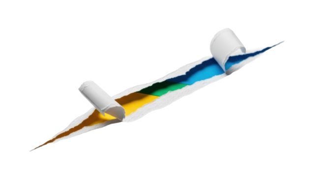 A crisp white surface dynamically torn, revealing a vibrant, optimistic saturated color underneath, in a minimalist studio with ample copy space, soft lighting, concept of breakthrough and revelation
