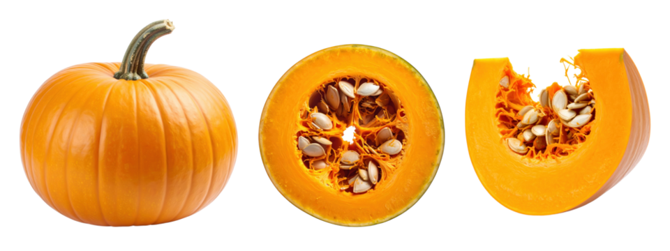 Pumpkin in Three Ways: A captivating composition of pumpkin, showcasing its full form, cross-section, and a slice, inviting culinary imagination and autumnal reverie.