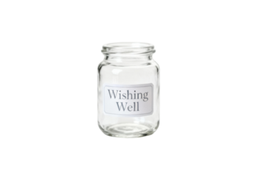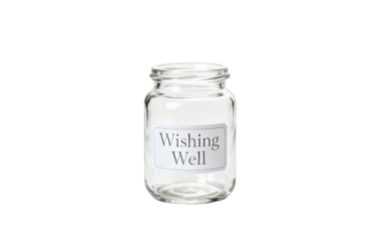An empty glass jar labeled Wishing Well isolated on a transparent background