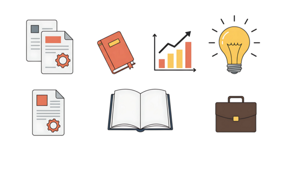 Illustration of icons representing business, education, and innovation with a lightbulb, graph, and books