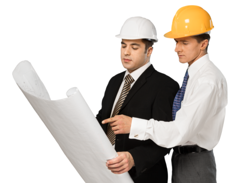 Architect reviewing blueprints at construction site isolated PNG with Transparent Background