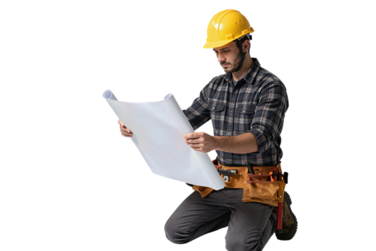 A focused construction worker in a yellow hard hat reviews blueprints, carefully planning a project with attention to detail. background removed