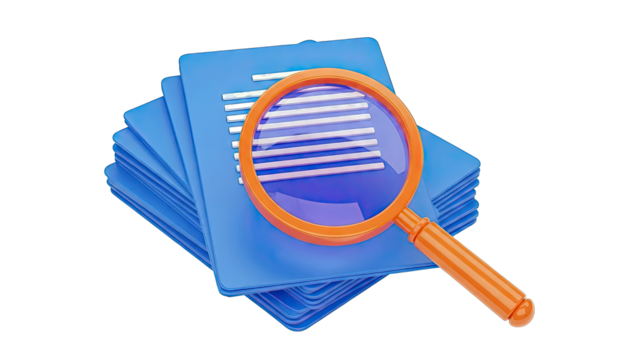 Magnifying Glass Over Stack of Blue Folders with Documents