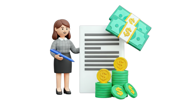 Businesswoman with Pen Reviewing Financial Documents and Money