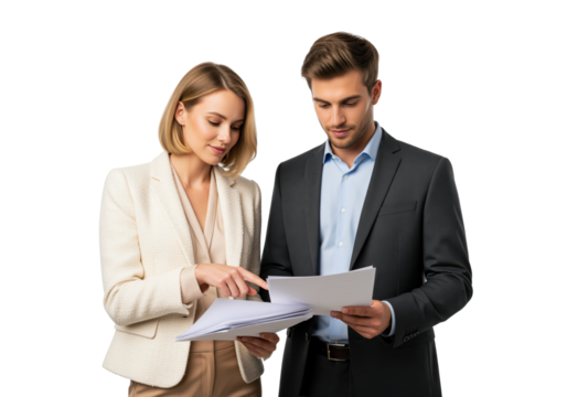 Smiling business professionals reviewing documents on transparent background