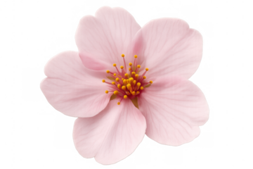 Pink sakura bloom with delicate petals and bright yellow stamens. Transparent background highlighting spring nature theme
