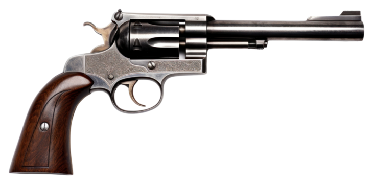 Generic wooden brown revolver gun png, isolated on white or transparent background, steel firearm, weapon pistol cut out