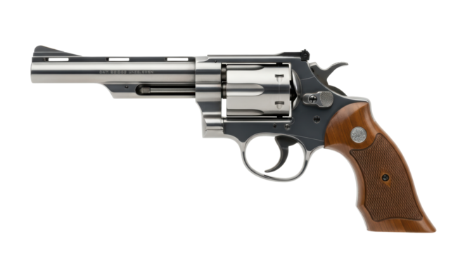 Polished stainless steel revolver with polished wood grip and black frame isolated on a transparent background