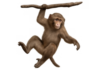 Rhesus macaque monkey hanging on wooden branch, primate animal isolated with transparent background