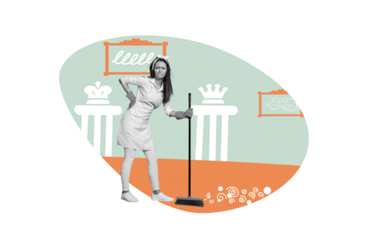Collage young houseworker service duty job back pain suffer ache spine rheumatism osteoporosis interior cleanup drawing background