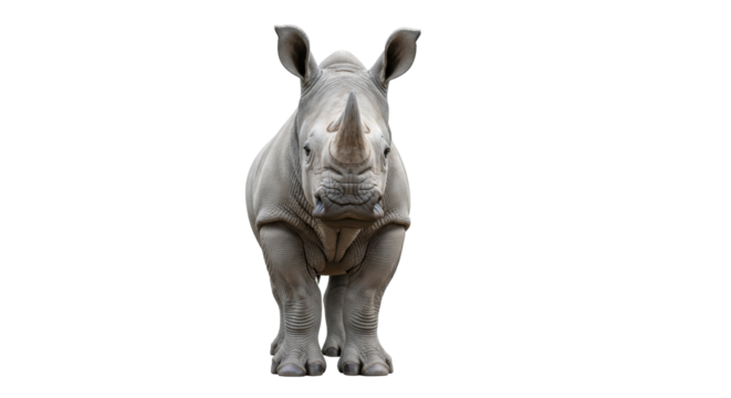 Isolated rhino standing and looking straight into the camera with a strong, powerful look