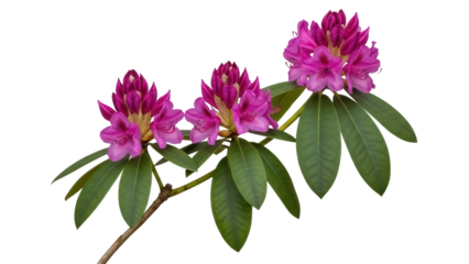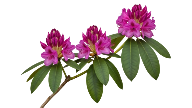 Isolated rhododendron blooming twig, vibrant purple flower cluster, lush green leaves, no background