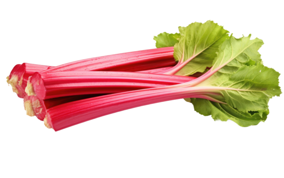 Freshly cut rhubarb stalks with vibrant green leaves on transparent background