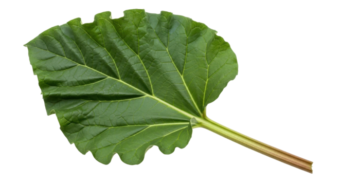 Isolated Rheum rhabarbarum leaf, rhubarb plant foliage, garden vegetable or herb, healthy eating
