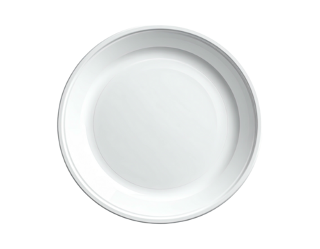 Top-down view of a pristine white, empty plate with a wide, slightly ribbed rim