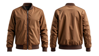 Front and back views of a brown, zippered bomber jacket with ribbed collar, cuffs, and hem