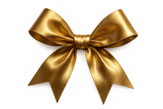 Golden satin gift bow creating a decorative knot, shiny ribbon element for luxury presents, isolated with transparent background