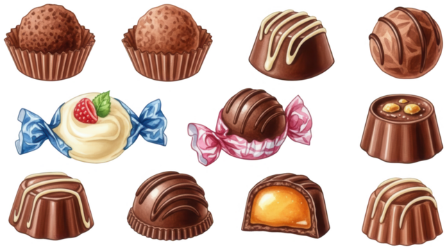 An assortment of intricately detailed, glossy chocolate confections and wrapped candies, featuring various shapes like domes, truffles, and molded forms, adorned, isolated on transparent background.