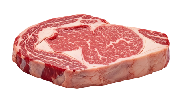 Raw ribeye steak with marbled texture, isolated on white. Premium beef cut for gourmet cooking, culinary concept