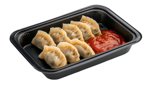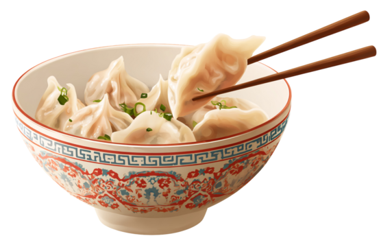 Bowl of delicious chinese dumplings with chopsticks isolated on transparent background
