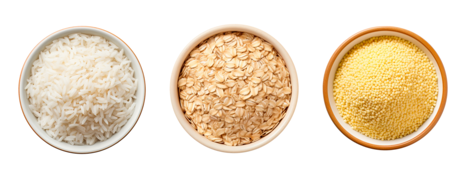 Various types of rice grains and rice plants isolated on a transparent background arranged in different piles and clusters for diverse culinary or agricultural purposes