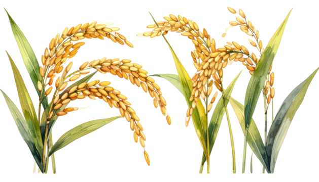 Two rice bundles, golden grain heads, green leaves, watercolor style, illustration, black background, realistic yet stylized