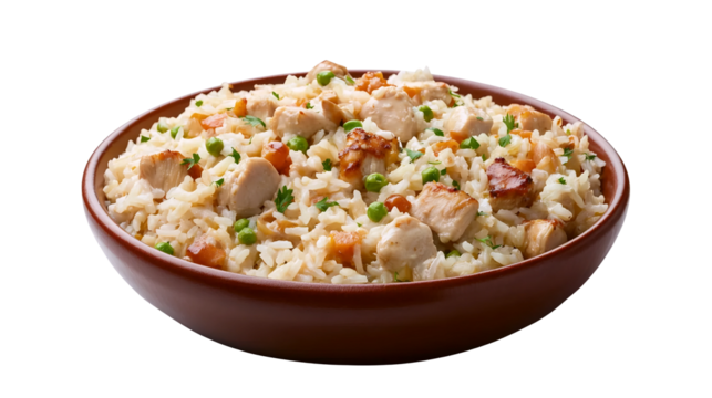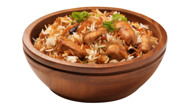 Delicious chicken biryani in a wooden bowl isolated on transparent background, a flavorful and aromatic rice dish with tender chicken pieces and fragrant spices