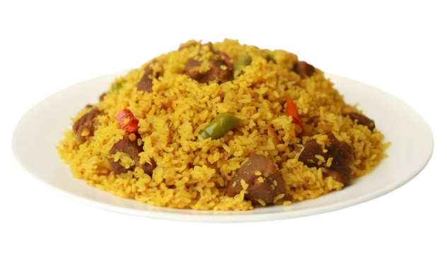 High-Resolution PNG of Golden Yellow Seasoned Rice with Meat Chunks and Bell Peppers on a White Plate - Authentic Jollof Rice Style or Spicy Pilaf - Transparent Background (Cutout)