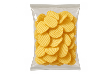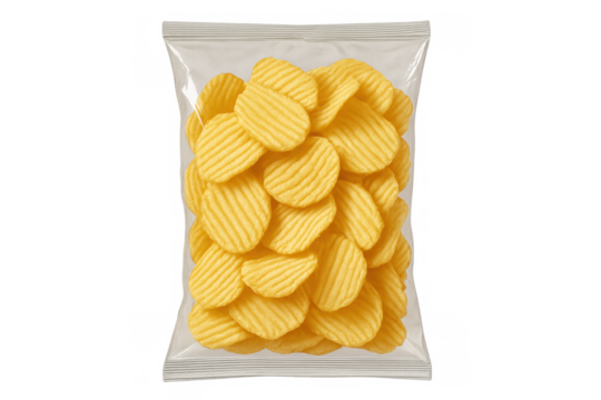 Potato chips in clear plastic bag, ridged crisp snack, junk food, isolated with transparent background