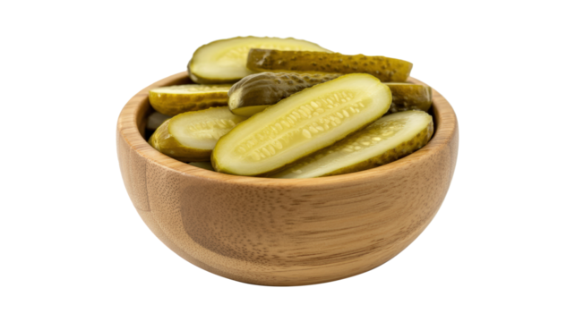A bowl of pickles sits on a white background
