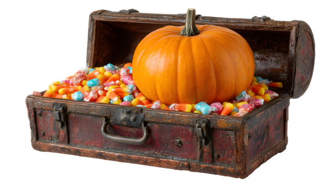 Pumpkin sitting in candy-filled treasure chest, isolated on white