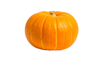 Vibrant orange pumpkin with vertical ridges sits isolated against a stark black background