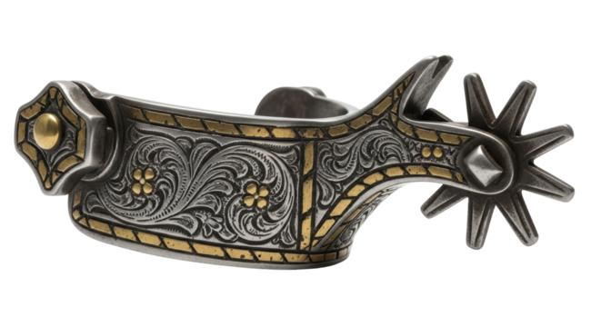 Ornate silver and gold cowboy spur isolated PNG, vintage western riding equipment for equestrian sports and cowboy culture