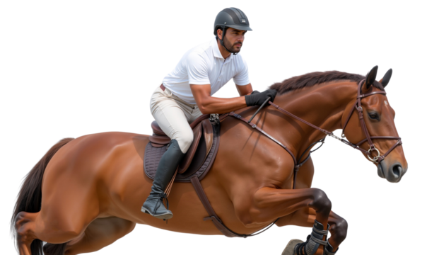 Handsome athletic man riding horse and show jumping isolated on transparent background