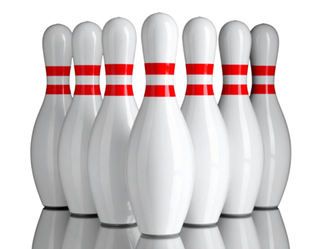 Close-Up View of Five Striped Bowling Pins for Recreational Play, isolated on a transparent background.