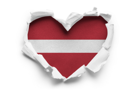 Heart shaped hole torn through paper, showing satin texture of flag of Latvia, cut out