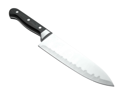 Illustration a silver chef's knife with a black handle isolated against a black background, angled to the right