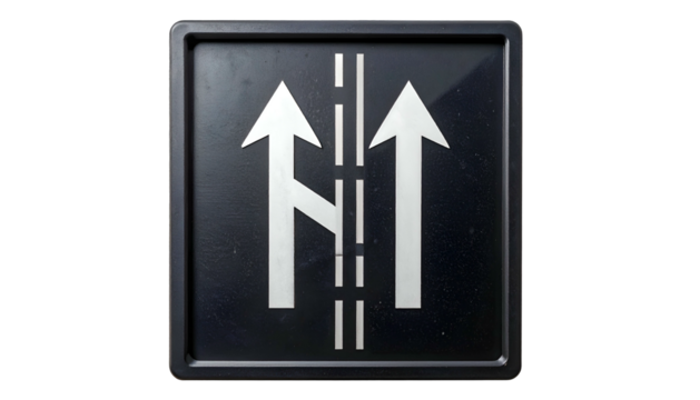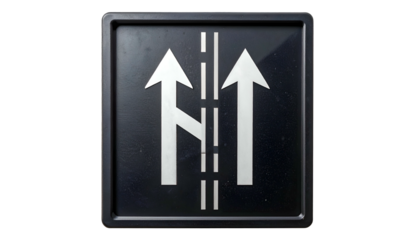 Square, black road sign with white arrows showing merge. Center dashed line