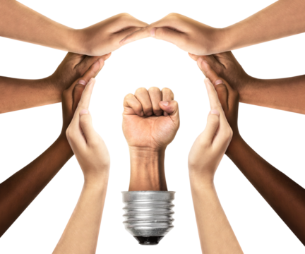 Empowered hands raised high, symbolizing unity, strength, and collective action on transparent