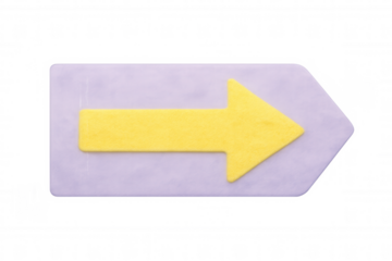 Yellow right-pointing arrow on purple label, transparently positioned, signaling direction and emphasizing key details against clean background