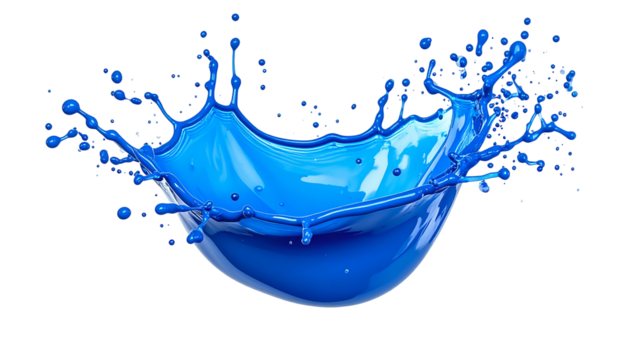 A vibrant blue paint splash erupts from a central point, set against a stark black backdrop