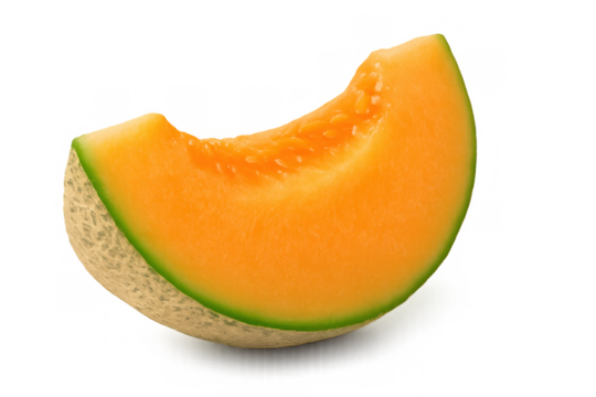 Ripe cantaloupe slice displaying vibrant orange interior, green rind against transparent backdrop