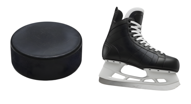 SPORT - Black ice hockey puck and skate isolated on white background, perfect for sports or hockey themed designs