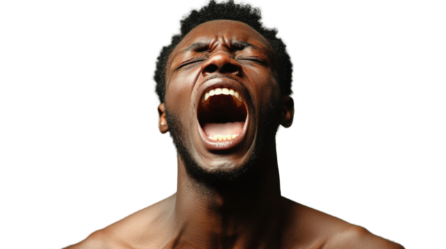 Human rights, black woman screaming with fist for protest and isolated against a transparent png background. Riot or announcement, justice or noise speech and female person shout for rally.