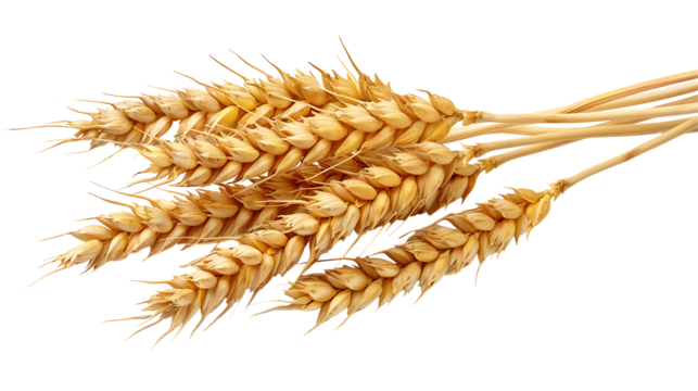 Golden wheat ears isolated on transparent background. Ripe cereal spikes, agriculture crop symbol, organic grain harvest illustration, natural farm food, bakery ingredient, organic flour, bread, beer